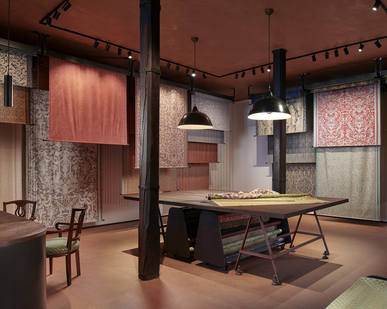 Uzimajući kao inspiraciju ljubav prema teatru i scenskoj umjetnosti osnivača kompanije, prostor je pretvoren u spektakularno okruženje nalik pozorištu, sa rolerima koji dramatično vise sa plafona kao pozadina. Mobilni kovčezi rađeni po mjeri otkrivaju kako vintage tako i savremene uzorke tkanina, uzdižući tkanine do razine umjetničkih djela.