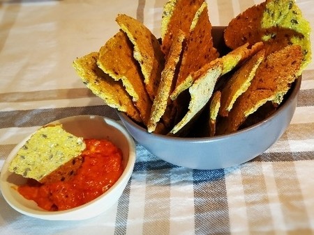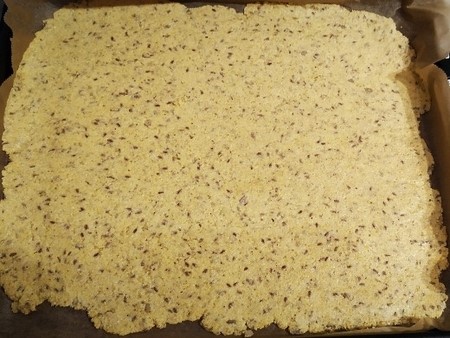 Istresti na papir za pečenje, prekriti drugim papirom i oklagijom razvaljati lagano preko cijelog pleha. Skinuti gornji papir i peći čips na temperaturi od 180 stepeni cca. 30 minuta.