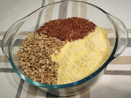 Ugrijati vodu do tačke ključanja, dodati maslinovo ulje i usuti u zdjelu sa kukuruznim brašnom i sjemenkama. Sve dobro izmiješati. Tekstura tijesta treba da bude malo gušća nego što je palenta (tako da količinu vode prilagodite potrebnoj gustoći tijesta).