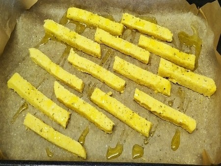 Ohlađenu palentu režite na prutiće i slažite na pleh obložen papirom za pečenje. Pospite maslinovim uljem, krupnom morskom soli i origanom.